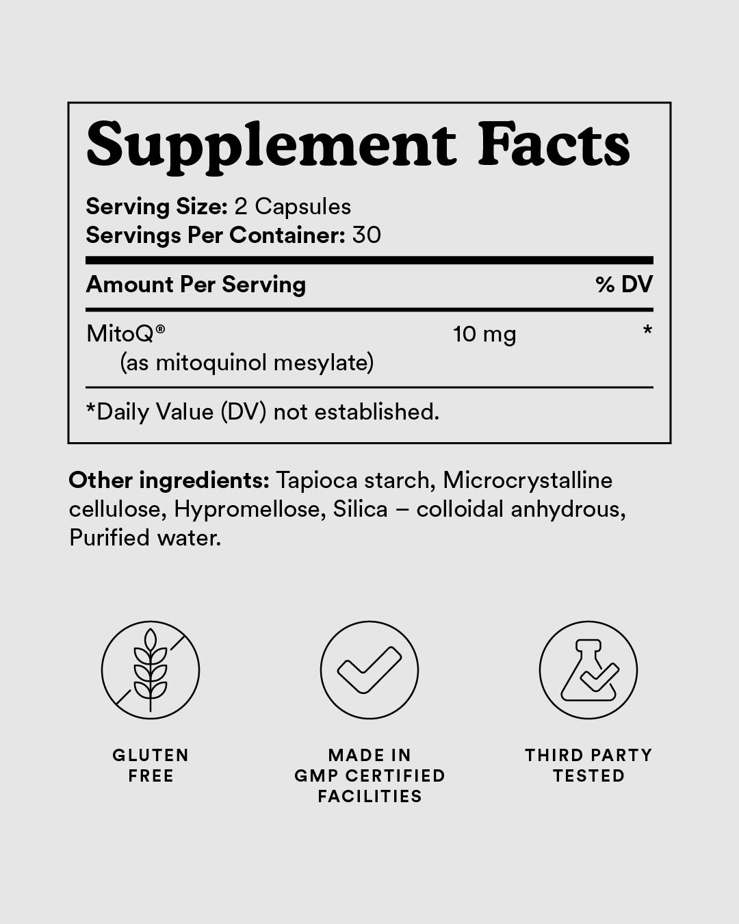 MitoQ Pure is powered by MitoQ® Mitoquinol—the world’s first antioxidant molecule designed to pass through the mitochondrial membrane. Once inside, it neutralizes free radicals at the source—promoting energy production, reducing the proportion of aged, dysfunctional cells, and slowing the effects of aging.